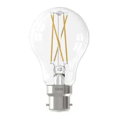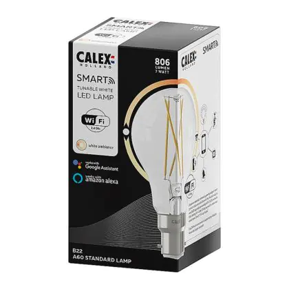 Ben je op zoek naar slimme B22 LED verlichting van topkwaliteit? Dan maak je met deze B22 Calex Smart LED Lamp een uitstekende keuze! Deze Calex Smart lamp heeft de B22 Bajonet fitting en helder glas, waardoor je het kooldraad (LED Filament) goed kunt zien. Qua vermogen verbruikt deze Smart verlichting slechts 7 Watt. Daardoor ga je fors besparen op je energiekosten, want deze slimme LED verlichting is de energiezuinige vervanger van conventionele B22 gloeilampen. Verder gaat deze Calex E27 LED verlichting 15.000 branduren mee en krijg je bij aankoop 2 jaar Lampdirect all-in garantie. Daarnaast draag je een steentje bij aan een schonere wereld, wanneer je kiest voor LED.
