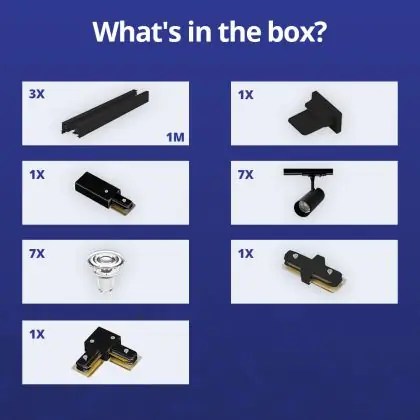 | Fabrikantnaam | Complete L shaped 1-Phase Track Set Black incl. 7x Spot fixture + GU10 2700K 3W Dim – 1 x 2 meter i | |
