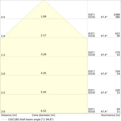 De gradenbundel geeft informatie over hoe breed het licht wordt uitgestraald. Dit zit tussen de 0 en 360 graden (D). Hoe kleiner de hoek, hoe specifieker de lichtbundel is. Over het algemeen is een smalle gradenbundel perfect voor sfeer- of accentverlichting, terwijl een brede gradenbundel ideaal is om grote oppervlaktes te verlichten.