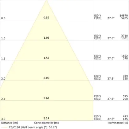 De gradenbundel geeft informatie over hoe breed het licht wordt uitgestraald. Dit zit tussen de 0 en 360 graden (D). Hoe kleiner de hoek, hoe specifieker de lichtbundel is. Over het algemeen is een smalle gradenbundel perfect voor sfeer- of accentverlichting, terwijl een brede gradenbundel ideaal is om grote oppervlaktes te verlichten.