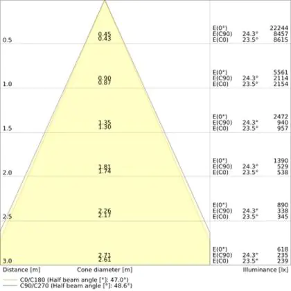 De gradenbundel geeft informatie over hoe breed het licht wordt uitgestraald. Dit zit tussen de 0 en 360 graden (D). Hoe kleiner de hoek, hoe specifieker de lichtbundel is. Over het algemeen is een smalle gradenbundel perfect voor sfeer- of accentverlichting, terwijl een brede gradenbundel ideaal is om grote oppervlaktes te verlichten.