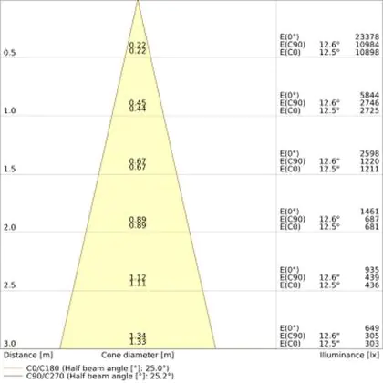 De gradenbundel geeft informatie over hoe breed het licht wordt uitgestraald. Dit zit tussen de 0 en 360 graden (D). Hoe kleiner de hoek, hoe specifieker de lichtbundel is. Over het algemeen is een smalle gradenbundel perfect voor sfeer- of accentverlichting, terwijl een brede gradenbundel ideaal is om grote oppervlaktes te verlichten.