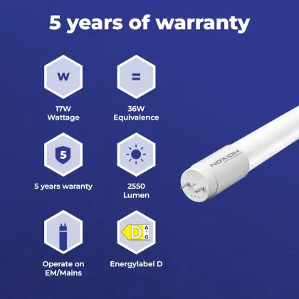 Deze Noxion LED TL buis heeft een Lumen / Watt efficiëntie van lm/W. Dit is de waarde die je verkrijgt door de lichtopbrengst (2550 Lumen) te delen door het wattage (17W) van deze lichtbron. Hoe weet je of jouw lichtbron een goede efficiëntie heeft? In dit geval ligt de lm/W waarde boven de 65. Je kunt er ook voor kiezen om een LED geïntegreerd TL armatuur te kopen. Hierbij heb je de keuze uit diverse (waterdichte) LED montagebalken, die in een divers aantal Lumen verkrijgbaar zijn. Een (dimbaar) LED paneel is ook een slimme optie, met name voor ruimtes met een systeemplafond (eenvoudige installatie) en kantoren (UGR<19 varianten).