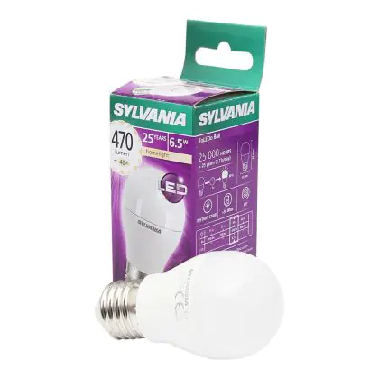 De Sylvania ToLEDo Ball E27 is de perfecte vervanger voor uw huidige halogeen en/of gloeilampen met E27 fitting, ook wel dikke fitting genoemd. De vorm wordt ook wel een kogellamp genoemd en kan in zowel open en gesloten armaturen gebruikt worden. Door de LED technologie bespaart u niet alleen op energiekosten maar ook op onderhoudskosten doordat de Sylvania ToLEDo tot wel 15x langer meegaat dan traditionele gloeilampen!
